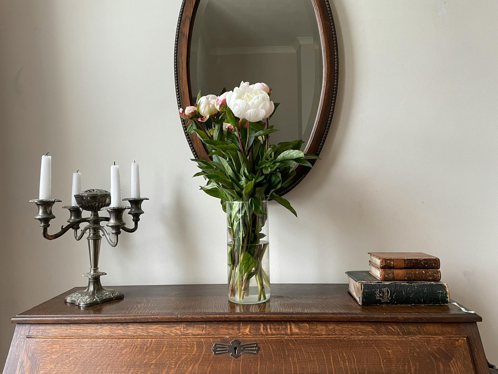 - świeże kwiaty w wazonie na stoliku lub konsoli,